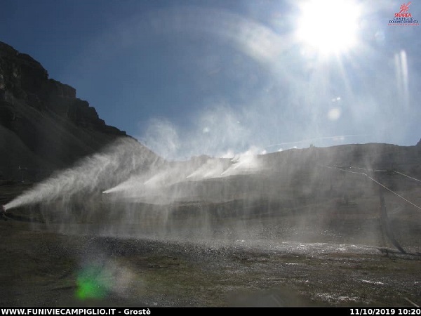 Grazie alle basse temperature del mattino, nei giorni scorsi è stato possibile mettere in funzione i cannoni sparaneve in diverse zone della Skiarea Campiglio. Qui sotto l’immagine della webcam al Grostè postata in facebook da Luca Ferrari di Madonna di Campiglio. Azionati anche i cannoni lungo il Canalone Miramonti. Per quest’anno ci sarÁ più tempo per la preparazione della 3Tre, che è in programma martedì 8 gennaio 2020. Buone notizie sono arrivate proprio in questi giorni dalla Svizzera. In occasione del Meeting autunnale della FIS all’Hotel Hilton di Zurigo, sono state decise le localitÁ e le date delle prossime tre stagioni di Coppa del Mondo di Sci alpino: Campiglio tornerÁ alla tradizionale data prenatalizia.