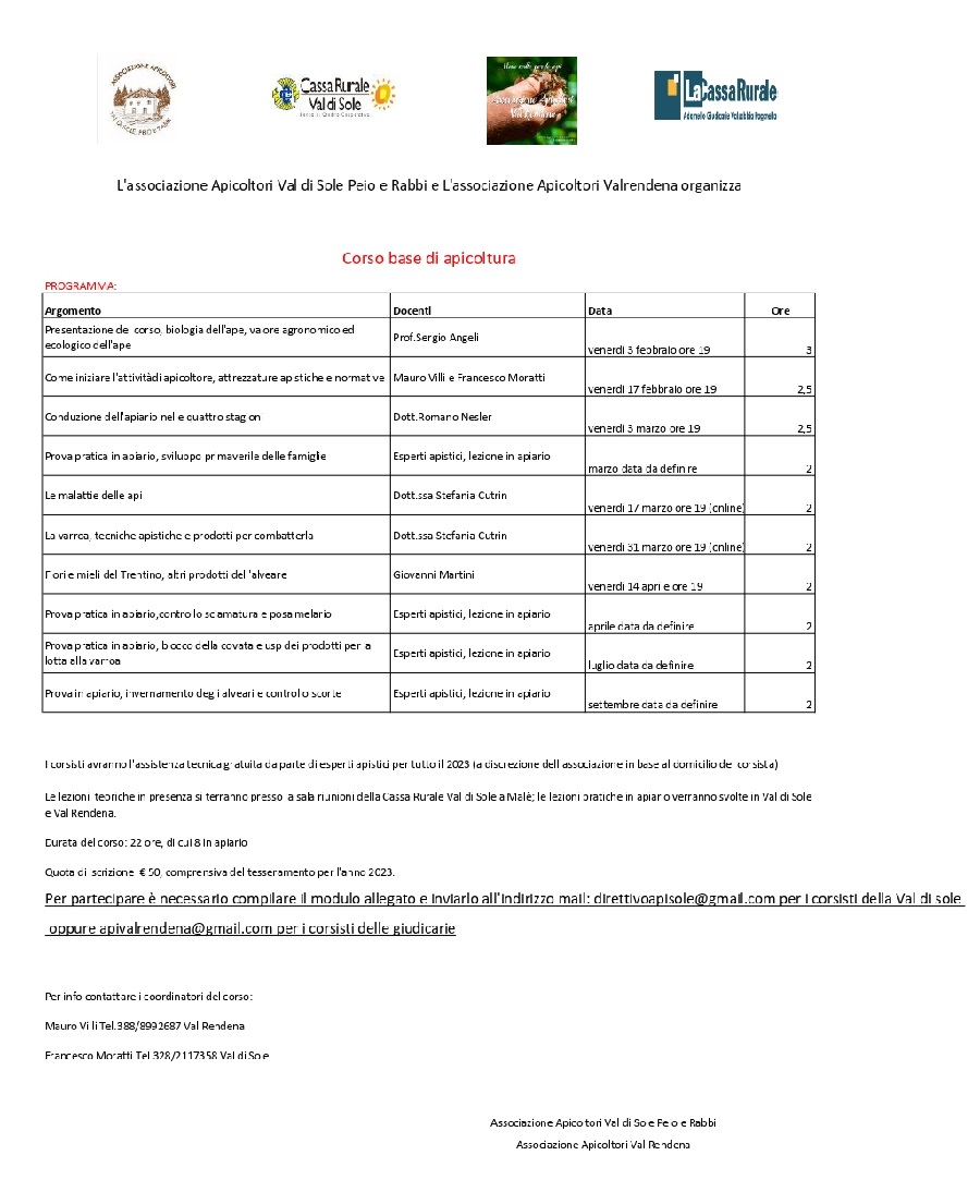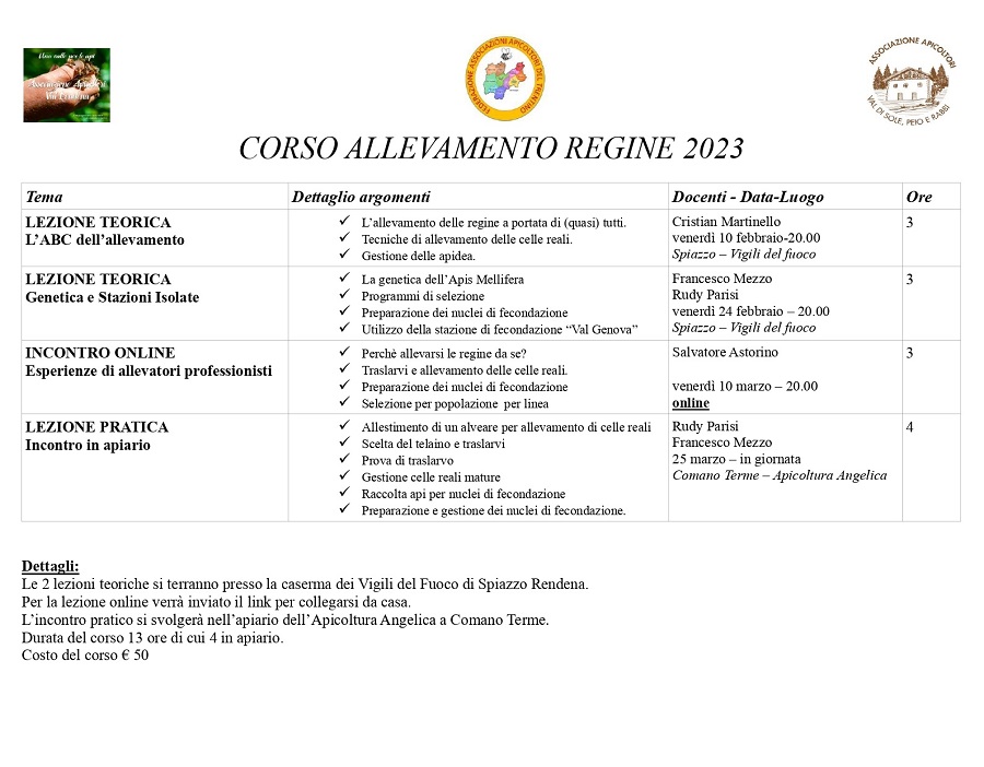 L’Associazione apicoltori Val Rendena, in collaborazione con la vicina Associazione apicoltori  Val di Sole Peio e Rabbi ha organizzato due corsi per il 2023. Il primo è un corso base di apicoltura ed è rivolto a tutti coloro che vogliono imparare le basi necessarie ad intraprendere questa  importantissima attività o semplicemente scoprire di più sull’affascinante mondo delle api . Il secondo è un corso riguardante l’allevamento di api regine, esso è rivolto agli apicoltori che vogliono imparare a crearsi autonomamente tali api. L’Associazione propone inoltre la possibilità di portare le nuove regine alla stazione di fecondazione in Val Genova presso la località Ragada. Inoltre offre l’assistenza tecnica gratuita a tutti gli associati. Tutto ciò per contribuire a creare un’apicoltura di qualità e un patrimonio apistico forte e sano. Di seguito trovate i programmi dettagliati.