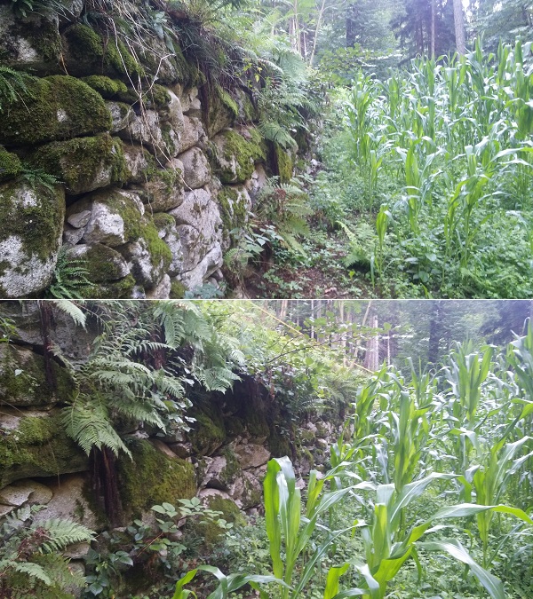La valorizzazione dei muretti a secco presenti in provincia di Trento riguarda anche la nostra Valle. Fino alla metà del secolo scorso, le zone meglio esposte al di sopra dei paesi della Rendena erano intensamente coltivate grazie al duro lavoro dei nostri antenati che avevano ricavato campi da coltivare in piano realizzando moltissimi muretti a secco. L’abbandono dell’agricoltura (dalla metà del XX secolo) in seguito all’arrivo del turismo, ha provocato l’abbandono di queste aree che sono state progressivamente occupate da boschi spontanei o da abetine piantate. Qualche volenteroso paesano ha già cominciato a ripristinare alcune di queste aree, tagliando abeti e arbusti e piantato qualche ortaggio o, addirittura, il granoturco, il "pane" dei nostri antenati. Queste foto le ho scattate lungo la strada per Pra Rodont, proco sopra la località Campicioi. Sarebbe bello se il Comune di Pinzolo, come hanno già fatto altri Comuni della Valle (Carisolo, Spiazzo Rendena e altri) promuovesse il recupero di queste "parti" e il recupero dei vecchi castagneti. Perchè non collaborare con l’Associazione Tutela del Castagno della Val Rendena?