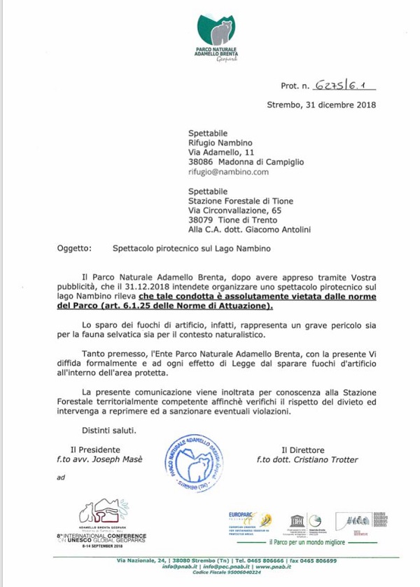 Ha scatenato un vespaio di reazioni la notizia della cena di Capodanno al rifugio Nambino con spettacolo pirotecnico sul lago ghiacciato. Molti gli interventi polemici sui social tanto che il presidente e il direttore del Parco sono intervenuti prontamente con una lettera inviata ai gestori del rifugio e alla Stazione Forestale di Tione, nella quale si ribadisce che lo scoppio di fuochi d’artificio sono vietati all’interno del parco. Il testo (che riportiamo qui sotto) è stato condiviso anche sui social.