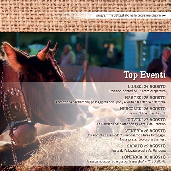 L’evento invita a rivivere le radici contadine della popolazione rendenese che per lunghi secoli, prima del boom del turismo invernale, vide nella zootecnia uno dei pochissimi fattori di sussistenza possibili su un territorio tanto difficile quanto ammirabile come quello delle montagne rendenesi. Pinzolo è pronto anche quest’anno a festeggiare la sua Razza Rendena, l’unica razza bovina autoctona del Trentino. Per informazioni dettagliate e conoscere le novità dell’edizione 2015 sfoglia la Brochure on-line al link