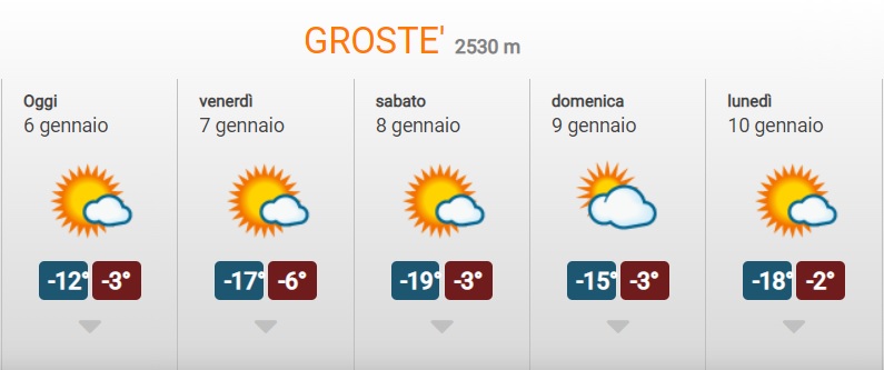 Grazie alla bellissima giornata di sole e alla nevicata di ieri, oggi le condizioni sono perfette per chi ama lo sci. E infatti sono tantissimi gli sciatori che, fin dall’apertura degli impianti, si stanno divertendo sulle piste di Pinzolo, Madonna di Campiglio e Folgarida-Marilleva. Fino a lunedì le previsioni di MeteoTrentino riportano tempo soleggiato e freddo, con minime della notte che, in cima al Grostè, sfioreranno i -20°C ! Eù