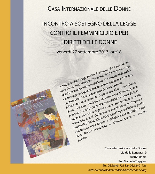 A sostegno della legge contro il femminicidio e per i diritti delle donne sarà dedicato l’incontro del 27 settembre alle 18h con la presentazione del libro: “ La maternità Maschile e altri saggi sull’uguaglianza tra donne e uomini da un altro punto di vista “ edito dalla casa editrice il Sextante di Mariapia Ciaghi.