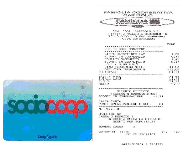 Sotto è riportata una spesa fatta con la tessera (ROSSA) di Coop Liguria, nella Fam. Cooperativa a Carisolo, e in particolare sono stati acquistati 3 tipi di articoli: