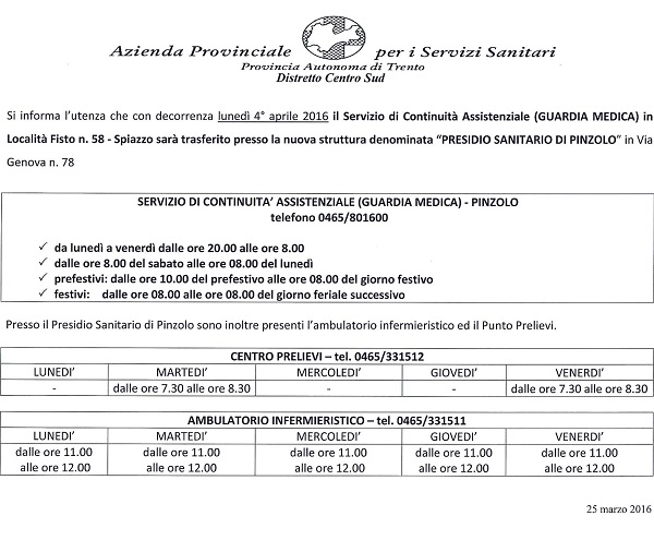 L’azienda Provinciale per i Servizi Sanitari della Provincia Autonoma di Trento ha comunicato che, dal 4 aprile 2016, il Servizio di Continuità Assistenziale (Guardia Medica) sarà trasferito da Fisto di Spiazzo presso il nuovo Presidio Sanitario di Pinzolo (via Genova n. 78).