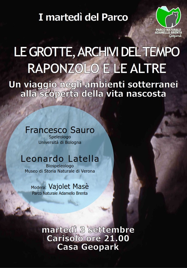 Carisolo – Per la rassegna "I martedì del Parco", domani sera, 3 settembre, alle ore 21.00 presso la Casa del Parco "Geopark", il Parco Naturale Adamello Brenta organizza la conversazione sulla natura dal titolo "Le grotte, archivi del tempo. Raponzolo e le altre.". Relatori di questo viaggio negli ambienti sotterranei dell’area protetta saranno Francesco Sauro, speleologo dell’Università di Bologna, e Leonardo Latella, biospeleogolo del Museo di Storia Naturale di Verona. Modererà Vajolet Masè, geologa del Parco. Ingresso libero.