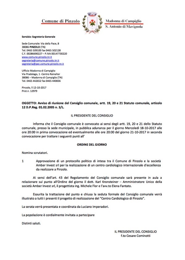 che mercoledì 18 ottobre alle ore 20.00 presso la sala consiliare del Municipio, il Consiglio Comunale tratterÁ l’approvazione del protocollo politico di intesa tra il Comune e la societÁ Amber Invest srl per la realizzazione a Pinzolo di un centro cardiologico internazionale d’eccellenza.