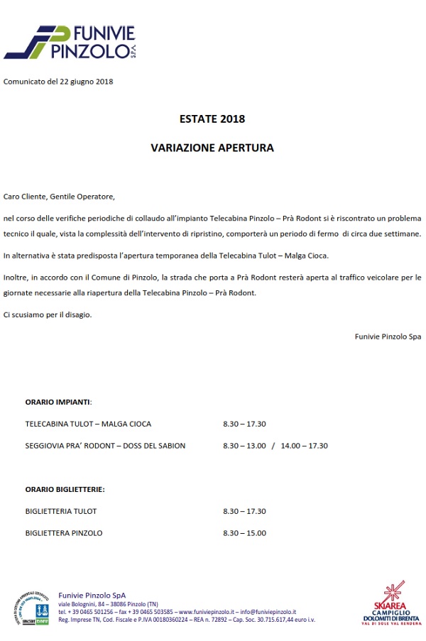 • 22 giugno 2018 – Comunicato delle Funivie Pinzolo