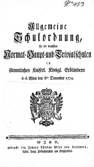 Il 6 dicembre 1774 venne promulgato il Regolamento scolastico generale (Allgemeine Schulordnung), che rimase in vigore fino alla metà dell’Ottocento.