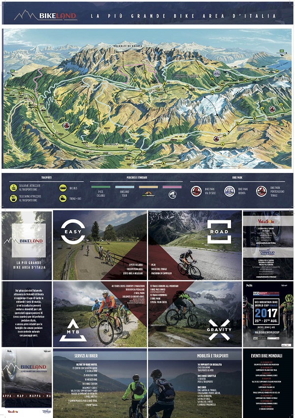 Una rete di percorsi, servizi, impianti di risalita e bike shuttle che rende unica l’esperienza del biker o dell’appassionato cicloturista. Tutto a portata di mano e a portata di tutti. Quattro i tratti distintivi della Bikeland: Easy, Mountainbike, Gravity e Road. Easy, per tutti, ma soprattutto per le famiglie e per chi in sella se la vuole prendere “easy”: 100 km di piste ciclabili su 3 tracciati che si sviluppano in contesti naturali d’eccezione, dalla Val di Sole alla Val Rendena fino alla ciclabile di Ponte di Legno-Passo Tonale. Mountainbike: per chi è allenato ci sono a disposizione 1.000 km di tracciati che si snodano tra i paesaggi mozzafiato del Parco Naturale Adamello Brenta fino alle sponde del Lago di Garda, tra pascoli, boschi e verdi vallate, per un totale di 40 tour cross country e marathon. Un tour ad anello che abbraccia tutto il massiccio del Brenta è da percorrere a tappe in più giorni, toccando i luoghi più suggestivi delle Dolomiti di Brenta. È il Dolomiti di Brenta Bike, che conta in totale 171 km e 7.700 m di dislivello per l’Expert Tour, 136 km con 4.600 m di dislivello per la versione Country. Gravity: per gli amanti delle emozioni forti, svariati sono i trails e i bike parks dove correre lungo migliaia di metri di dislivello in discesa. Tre sono i bike park della Bikeland, il Brenta Bike Park di Pinzolo, il Bike Park Val di Sole e il Bike Park Ponte di Legno Tonale. Ma non è finita qui: la Bikeland offre ai più atletici 13 trails enduro all-mountain, 13 trails downhill e 1 pista four cross. A disposizione anche 1 campo pratica per il bike trial e uno per il pump track. E per chi ama la grande salita, quella dei veri campioni, 3 sono le Grandi Salite del Trentino che si trovano nel territorio della Bikeland: Passo Tonale, Madonna di Campiglio e Pejo, più volte assolute protagoniste del Giro d’Italia, con numerosi e decisivi arrivi di tappa. Un’esperienza tutta road da fare in volata.