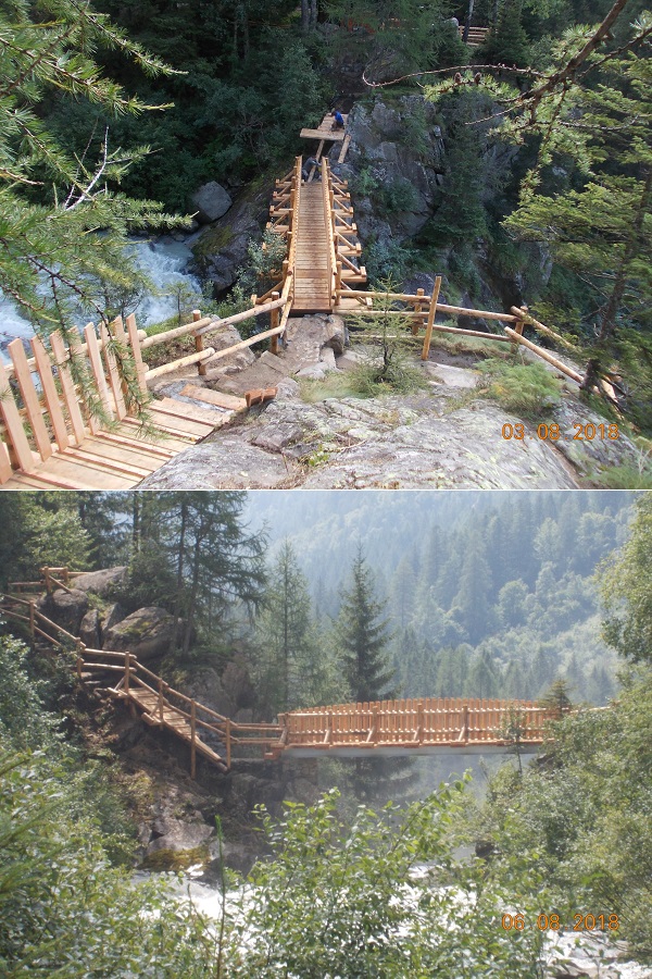 Le passerelle sono state ricostruite conformemente a quelle originali in legno di larice grezzo, secondo quanto previsto dal manuale tipologico del Parco. Considerate però la notevole luce delle campate e le forti sollecitazioni a cui si possono trovare sottoposte, si è ritenuto più sicuro realizzare in acciaio le travi principali delle due passerelle. Sono stati rifatti anche gli accessi sia in destra che in sinistra orografica, anch’essi con pavimentazioni, parapetti e staccionate nuovi.