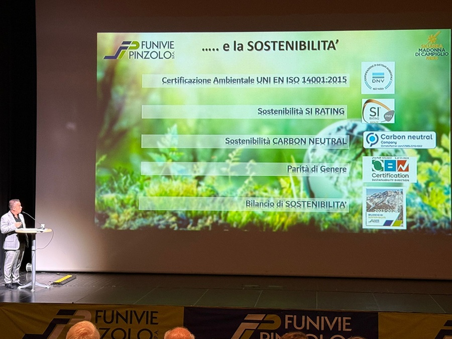 Il Direttore Baldessari, riassume nella prima slide il connubio tra Funivie Pinzolo e la sostenibilità, attraverso un percorso ventennale iniziato con la Certificazione Ambientale UNI EN ISO 14001:2015 e proseguito con una forte accelerazione negli ultimi anni fino a raggiungere la neutralità carbonica, in particolare si è evidenziato come la scelta di passare al 100% energia proveniente da fonti rinnovabili ha permesso di ridurre drasticamente l’impronta carbonica con un calo delle emissioni pari al 75% in soli tre anni.