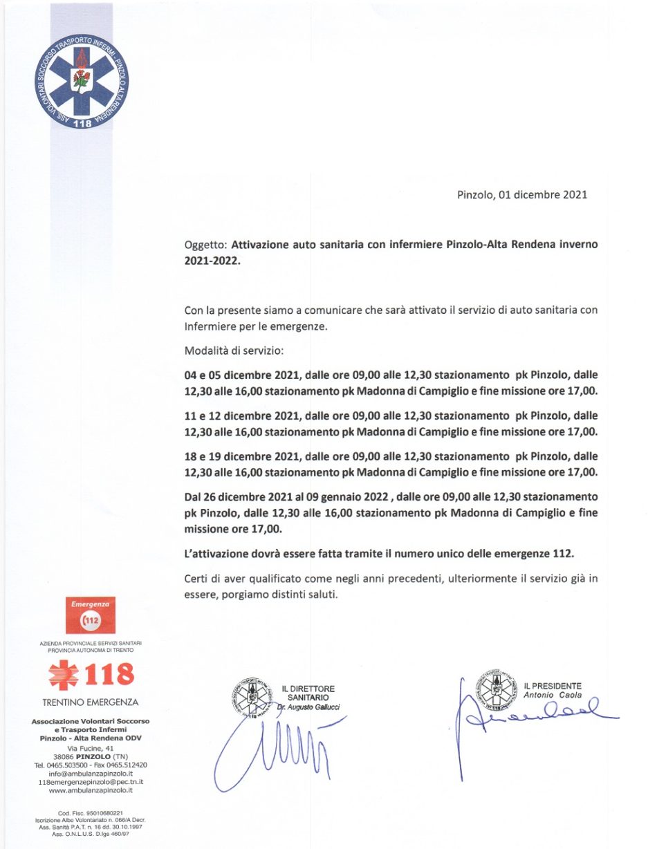 • Attivazione auto sanitaria con infermiere Pinzolo-Alta Rendena inverno 2021-2022