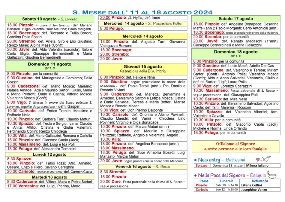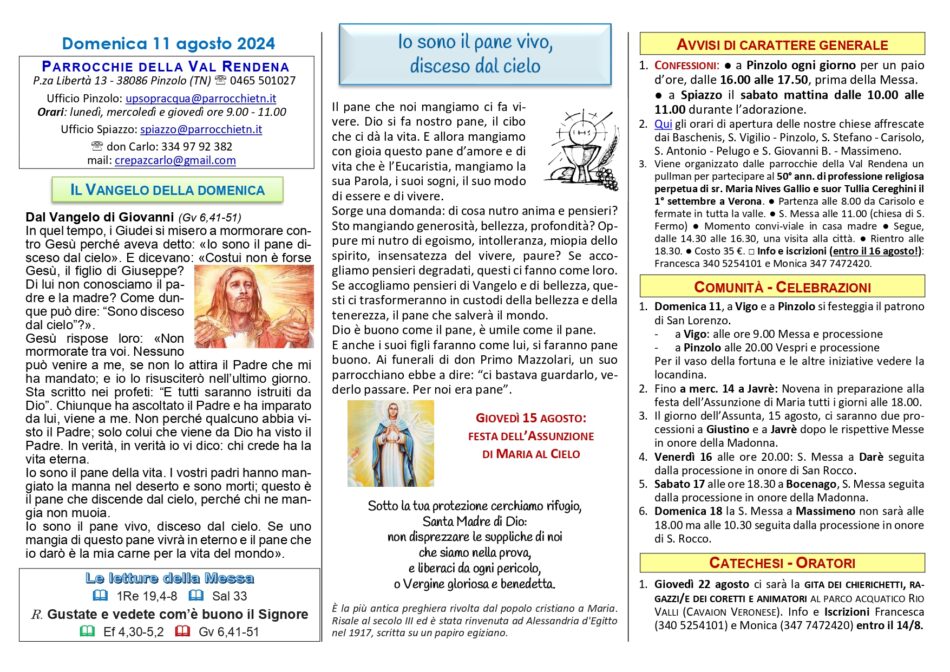 Avvisi Parrocchiali – dall’11 al 18 agosto 2024