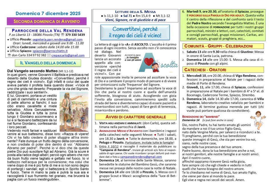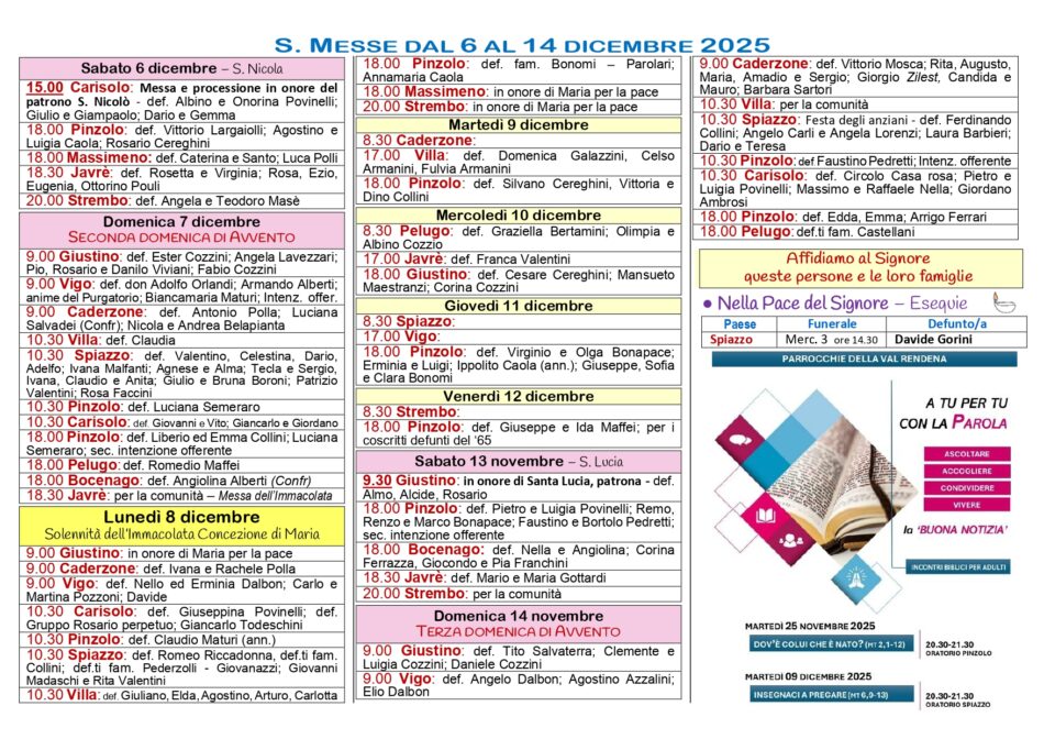 • Avvisi Parrocchiali: Settimana dal 7 al 14 dicembre 2025