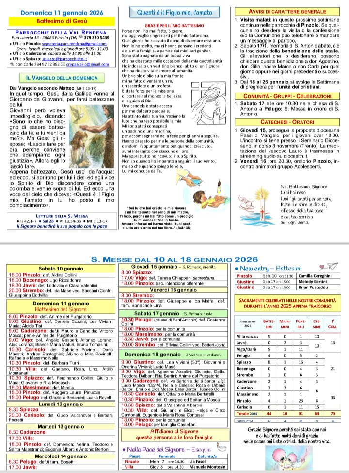 • Avvisi Parrocchiali: Settimana dall’11 al 18 gennaio 2026
