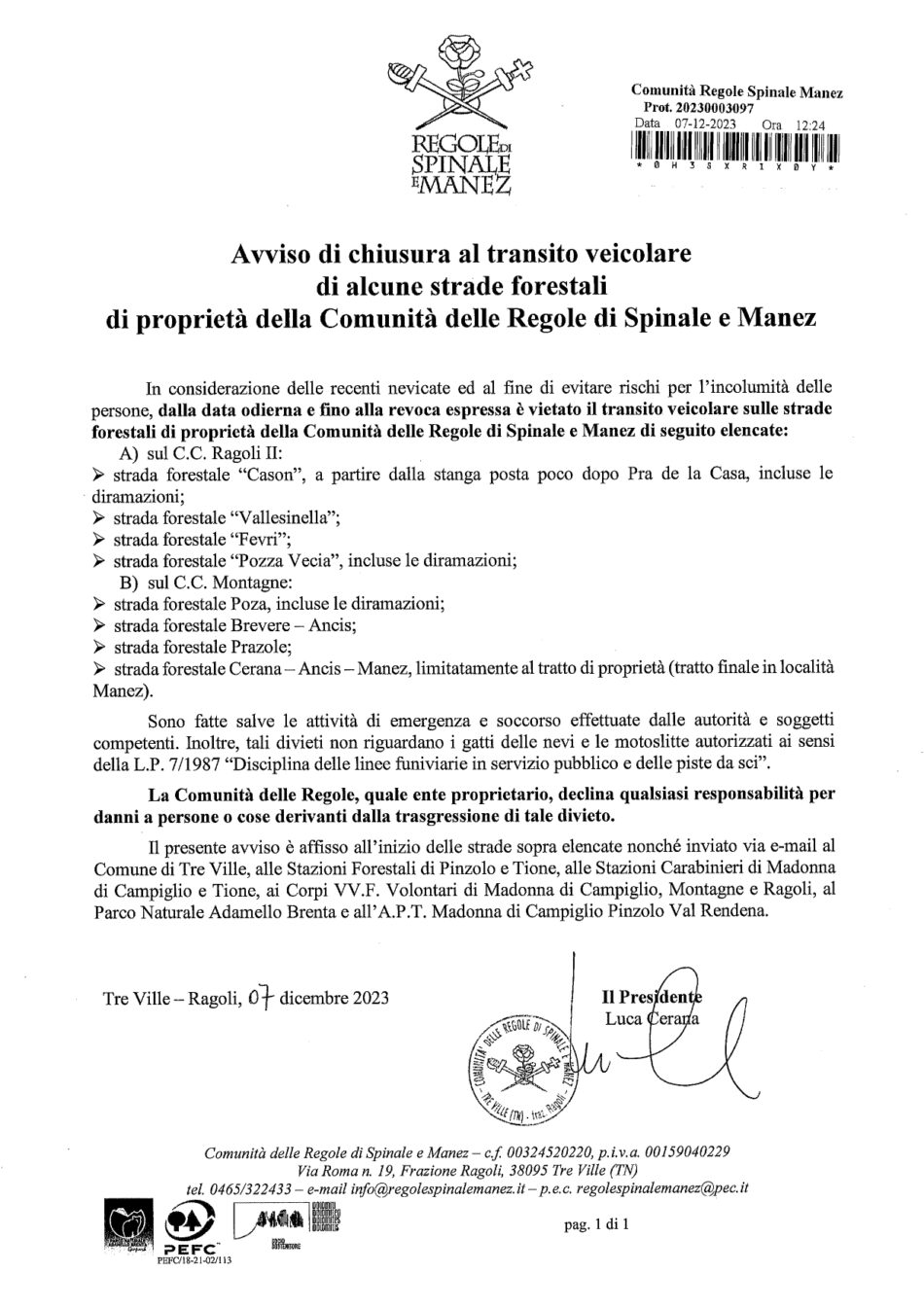 • Avviso di chiusura al transito veicolare di alcune strade forestali
