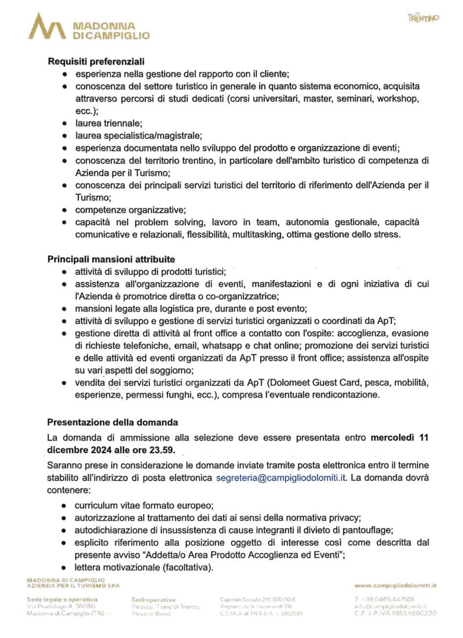 Avviso per la selezione di una risorsa per lo svolgimento della mansione di ADDETTA/O AREA PRODOTTO, ACCOGLIENZA ED EVENTI