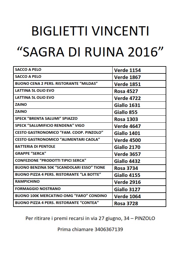 • Biglietti vincenti Sagra di Ruina 2016