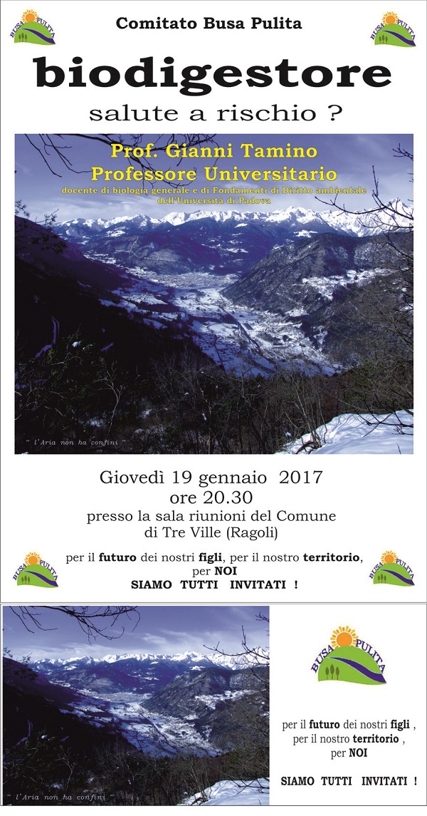 Il comitato prosegue la sua attivitÁ  di informazione proponendo una nuova serata pubblica giovedì 19 gennaio 2017 presso la sala riunioni del comune di Tre Ville a Ragoli alle ore 20.30 con relatore il Prof. Gianni Tamino , Professore Universitario docente di biologia generale e Fondamenti di Diritto ambientale dell”™UniversitÁ  di Padova , per il futuro dei nostri figli , per il nostro territorio e per noi siamo tutti invitati .