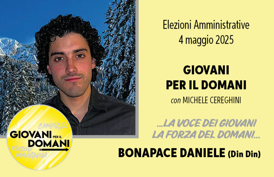 Mi chiamo Daniele Bonapace Din Din di Pinzolo, ho 24 anni, sono perito agrario e libero professionista. Da sempre legato alla mia terra, gestisco un allevamento di bovini per una nota macelleria della zona, un lavoro che mi tiene in contatto ogni giorno con la natura, gli animali ed i ritmi autentici della montagna. Oltre al mio lavoro mi impegno attivamente nella vita della comunità: faccio parte del coro Presanella, portando avanti con orgoglio le tradizioni culturali e musicali del nostro territorio, sono volontario bei Vigili del Fuoco e quando posso mi piace aiutare nelle associazioni come Pro Loco e Alpini. Ho scelto di candidarmi perché credo profondamente nel valore della partecipazione attiva: voglio essere una risorsa per la nostra comunità, portare la mia competenza, ascoltare le persone, rappresentare i loro bisogni e contribuire per costruire un futuro che sappia tenere insieme comunità, identità e tradizione senza rinunciare a sviluppo e innovazione.