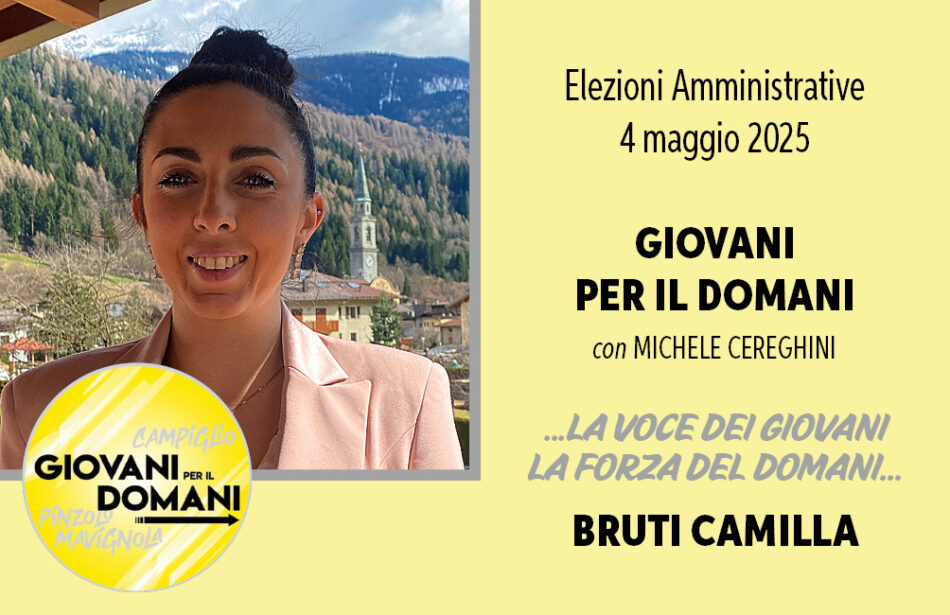 Sono Camilla Bruti e ho 27 anni. Sono nata e cresciuta a Pinzolo, anche se per motivi di studio ho passato lunghi periodi all’estero (Inghilterra, Spagna e Austria). Sono laureata in Diplomazia e Cooperazione Internazionale e ho un master in Europrogettazione, percorso concluso con un tirocinio presso un’azienda di Pavia. Ho lavorato un anno presso la Presidenza del Consiglio provinciale a Trento, dove ho aiutato nell’organizzazione della seduta congiunta dell’Euregio. Ho sempre avuto una grande passione per la politica, la quale ha influenzato molto i miei percorsi accademici, nata anche dal fatto che in famiglia se n’è sempre parlato. Ho deciso di candidare perché credo nel futuro del nostro Comune e della nostra Comunità e spero di poter mettere a disposizione le conoscenze e competenze che ho acquisito con i miei studi e le mie esperienze.
