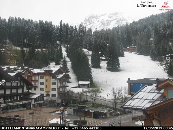 Ecco come si presenta stamattina il centro di Madonna di Campiglio: questo inverno non se ne vuole proprio andare. Circa 15 i centimetri di neve fresca caduti in quota.