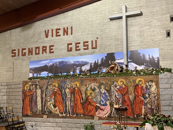 Dopo svariati anni di allestimento del presepe nella zona del fonte battesimale, quest’anno si è scelto di posizionare la ricostruzione della Natività e dell’Adorazione dei Magi nella zona sovrastante il mosaico della Chiesa di Santa Maria Nuova.