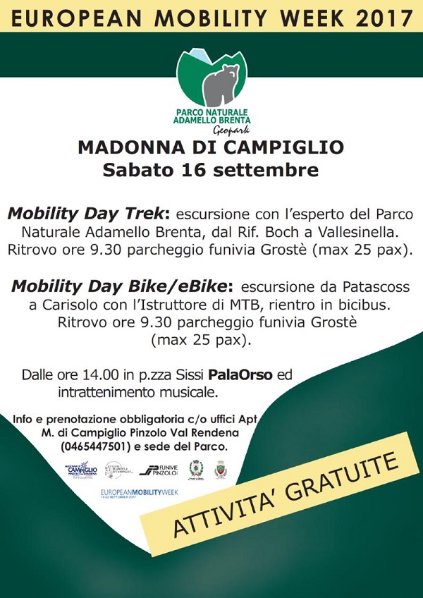 Il Parco Naturale Adamello Brenta e l’Azienda per il Turismo Madonna di Campiglio Pinzolo Val Rendena aderiscono insieme alla famosa campagna European Mobility Week (16 – 22 settembre 2017) con una proposta che unisce la sensibilizzazione con il divertimento.