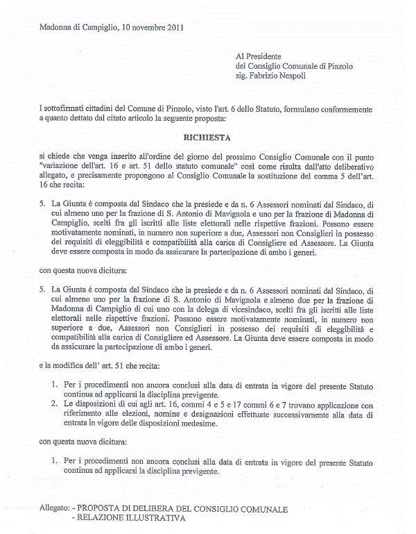 strumentale è l’atteggiamento della maggioranza comunale ed in modo particolare dei consiglieri di Madonna di Campiglio che la compongono. Questi anziché assumersi la responsabilità politica della proposta si trincerano, si nascondono, dietro un incoerente ed immotivato parere espresso dal Segretario. Tra l’altro questo parere esce come il coniglio dal cappello quando e nel momento in cui la maggioranza mostra tutta la sua incapacità di affrontare e rispondere ad una giusta richiesta di cittadini di Madonna di Campiglio. Il sindaco era sindaco anche nel 2006 quando fu approvato dal consiglio comunale lo Statuto vigente. Ricorderà il sindaco che sulla questione che oggi ci interroga si discute sia in commissione competente appositamente costituita sia in Consiglio Comunale. La problematica allora riguardava la frazione di S. Antonio di Mavignola che talvolta non riusciva ad esprimere neppure un Consigliere Comunale. Fu con l’apporto e la determinazione tra l’altro del Consigliere Collini Massimo che si ritenne opportuno garantire alle frazioni di Sant Antonio di Mavignola e di Madonna di Campiglio un loro rappresentante in giunta indipendentemente dal risultato elettorale conseguito da quelle due realtà di paese. Il segretario che lo era anche allora appositamente interpellato dichiarò che rientrava nell’autonomia statutaria del comune articolare la composizione della giunta con espressa riserva Statutaria con riferimento alla sua composizione. Ora la pensa diversamente; si potrebbe mutuare quel detto meglio tardi che mai? Nasce spontanea la domanda perché solo ora ha ritenuto necessario interpellare anche la Regione? Forse il Segreteria esprime le proprie opinioni, con relativo approfondimento, solo conformemente alle esigenze della maggioranza che governa il Comune? Infatti se vi fosse coerenza nel suo comportamento oggi non dovremmo deliberare sull’integrazione alla norma dello Statuto che amplia la tutela di rappresentanza di Madonna di Campiglio bensì anche relativamente all’abrogazione della norma stessa che ne prevede, seppur minima, una rappresentanza in Giunta di persone residenti a S. Antonio di Mavignola e Madonna di Campiglio. Così non essendo risulta evidente la strumentalità del tardivo parere del Segretario Comunale;