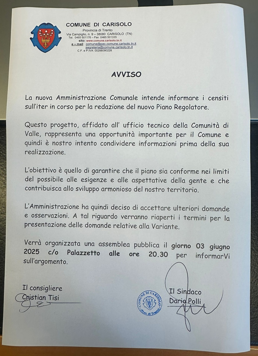 • Carisolo – La nuova Amministrazione comunale informa i censiti sul nuovo Piano Regolatore