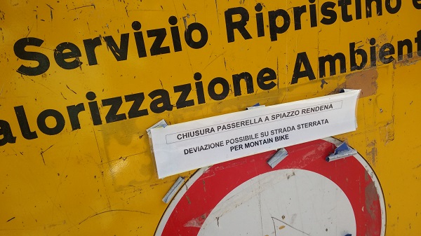 Sul cartello di chiusura è posto la seguente scritta, in piccolo: “Chiusura passerella a Spiazzo Rendena –