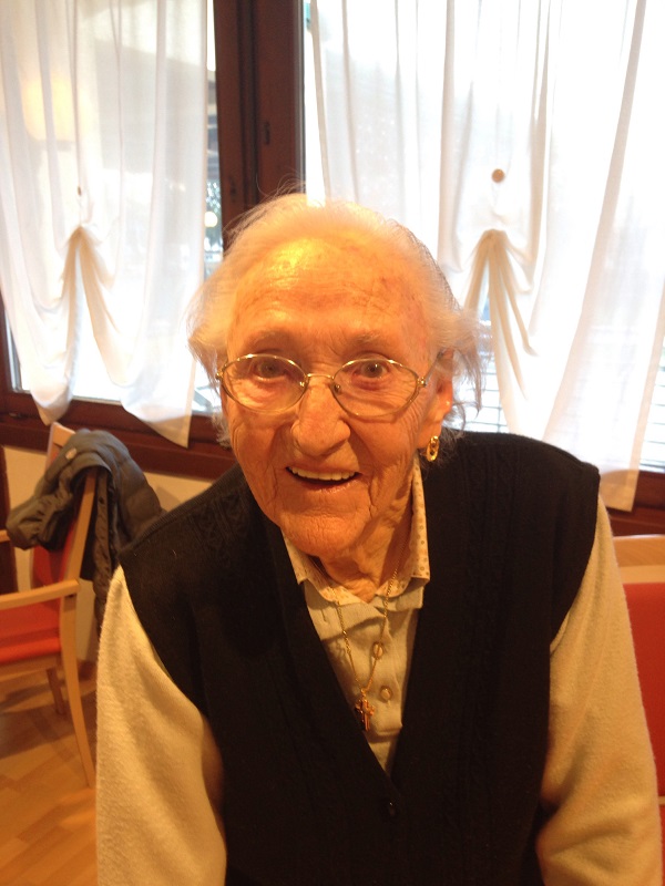 Mio marito lavorava per le ferrovie e a quei tempi bisognava adattarsi e se te lo chiedevano bisognava anche trasferirsi. Così noi siamo andati a vivere a Fortezza. Non era proprio un bel posto, ma con la pazienza ci siamo abituati. Lì  sono nati i nostri tre figli: Franco, Mariaclara e Teresa. Franco ancora vive li a Fortezza ! Tanti sacrifici e tanto lavoro, poi un incidente occorso a mio marito e tante visite e cure per gli ospedali. Nel 1975, dopo che i figli si sono tutti sistemati, siamo tornati a vivere a Villa. Era sempre stato il nostro desiderio. Nel 1979, purtroppo, sono rimasta sola. Cento anni!!! Sono un secolo! E a me sembra che sia passato pochissimo tempo: Mi ricordo tutto. A Villa ci sono stata fino al 2015 quando, a causa di un piccolo infortunio, mi sono resa conto che forse era meglio avvicinarmi alla casa di riposo. Ed eccomi qui a Pinzolo! Mi trovo molto bene, ho scelto proprio io questa Casa. Mi arrangio a fare tutto”¦.ho anche io le mie magagne, mi fanno male i piedi, la schiena,”¦. Però ho ancora la forza di alzarmi, sistemarmi e camminare da sola. Faccio anche fisioterapia, ginnastica. Mi piace giocare a carte e ci troviamo sempre nella bella stube, a fare qualche partita e mi diverto così. Mi piace anche fare quattro chiacchiere in compagnia. Molto spesso le persone che incontro e che sanno la mia etÁ , mi dicono che farebbero la firma per raggiungere il traguardo dei cento anni così in forma ! rispondo a loro, per scherzare, che io invece non ho fatto nessuna firma !!! ah ah ah “.