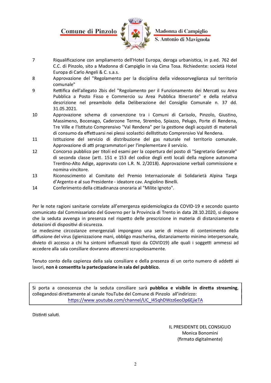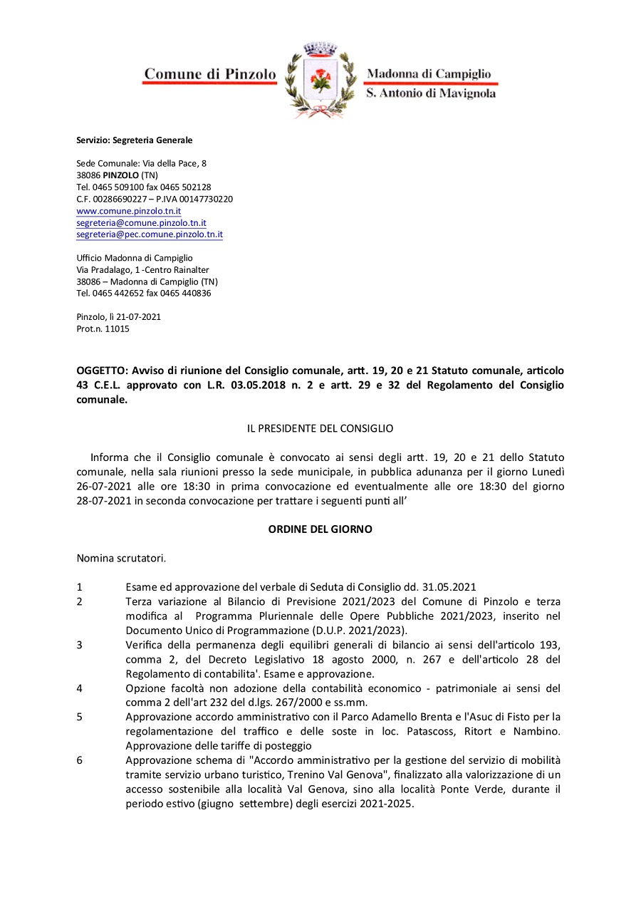 • Comune di Pinzolo: Avviso di riunione del Consiglio comunale