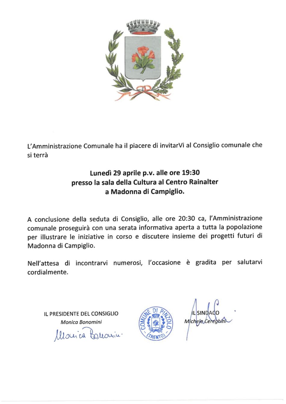 • Comune di Pinzolo – Consiglio Comunale Lunedì 29 aprile presso il Centro Rainalter di Madonna di Campiglio