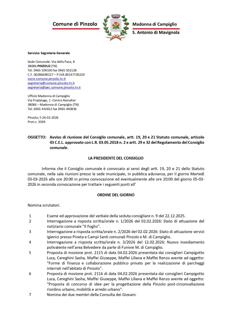 • Comune di Pinzolo – Convocazione e comunicazione O.d.G. Consiglio Comunale del 03-03-2026