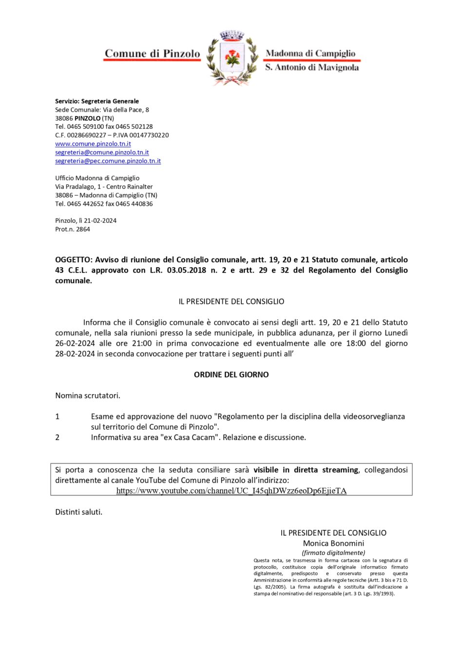 • Comune di Pinzolo – Convocazione e comunicazione O.d.G. del 26-02-2024