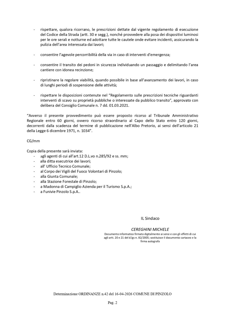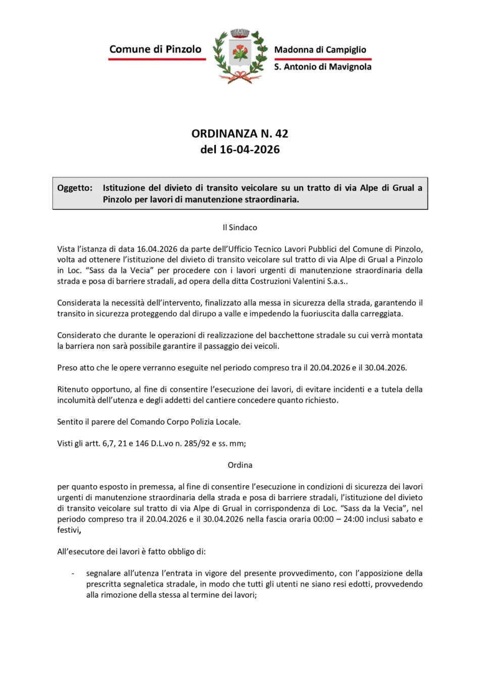 • Comune di Pinzolo: divieto di transito veicolare su un tratto di via Alpe di Grual