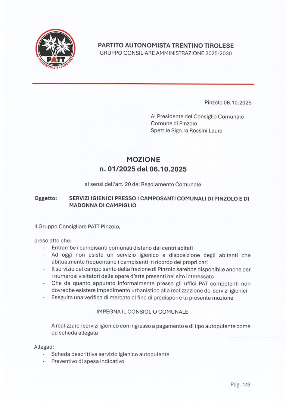 1. Mozione – Servizi igienici autopulenti presso i cimiteri comunali di Pinzolo e Madonna di Campiglio