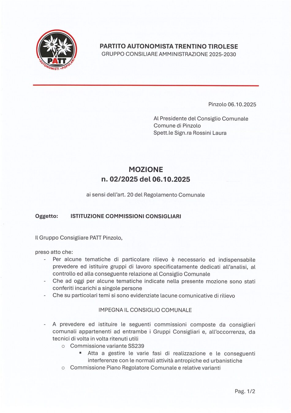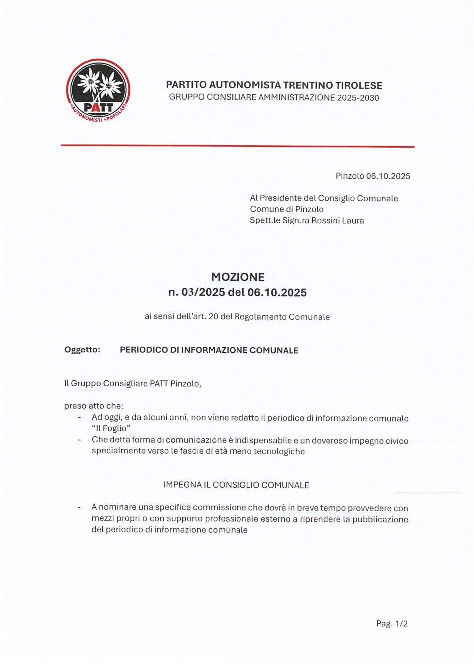 Comune di Pinzolo: mozioni e interrogazione depositate dal Gruppo Consigliare PATT