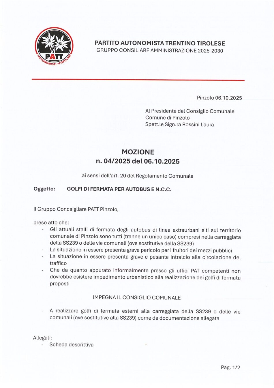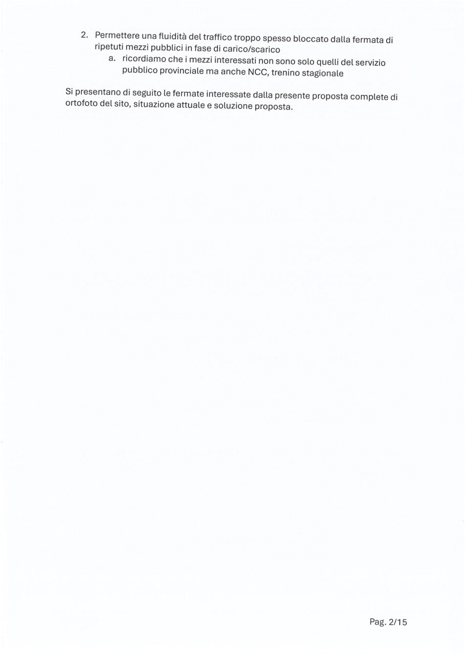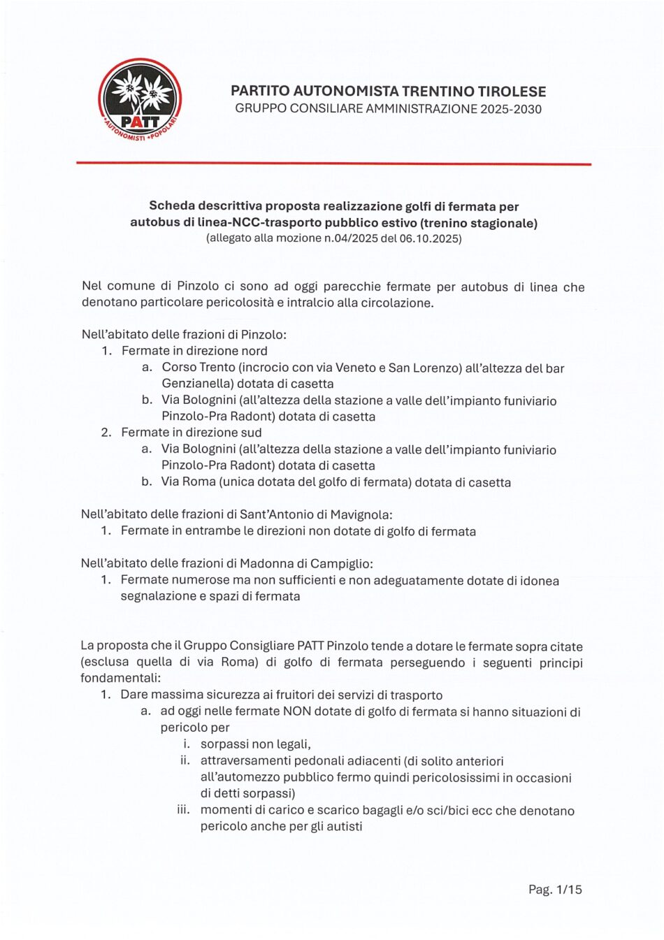 La mozione riprende una precedente interrogazione relativa alla pericolosità delle fermate degli autobus nelle tre frazioni, dove i mezzi sostano in mezzo alla carreggiata, causando sorpassi azzardati, rischio per i pedoni e rallentamenti del traffico.