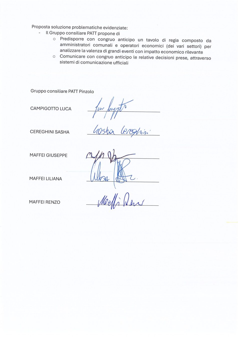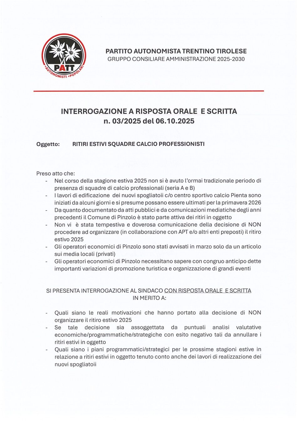 (In allegato: mozioni e interrogazione depositate dal Gruppo Consigliare PATT)