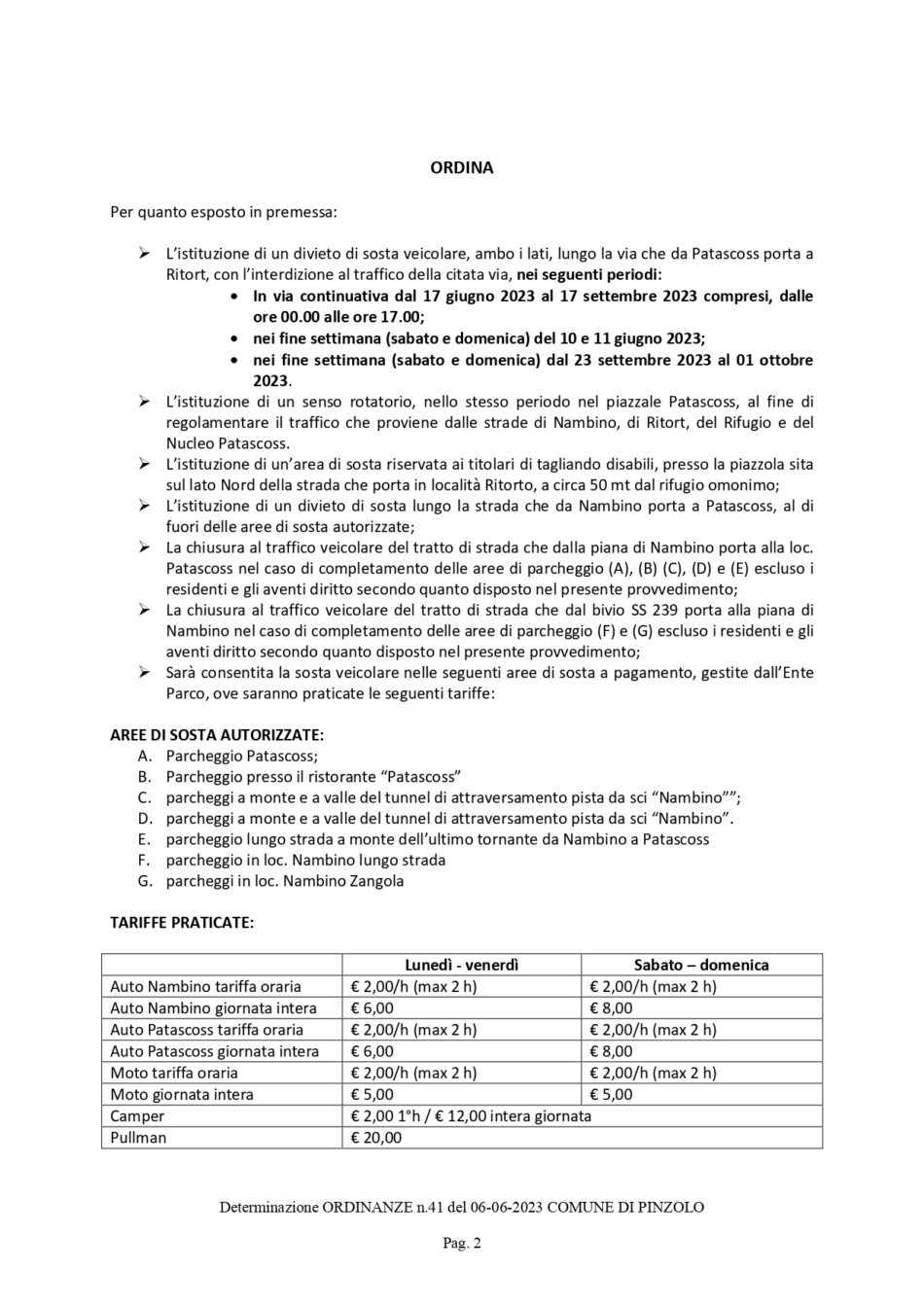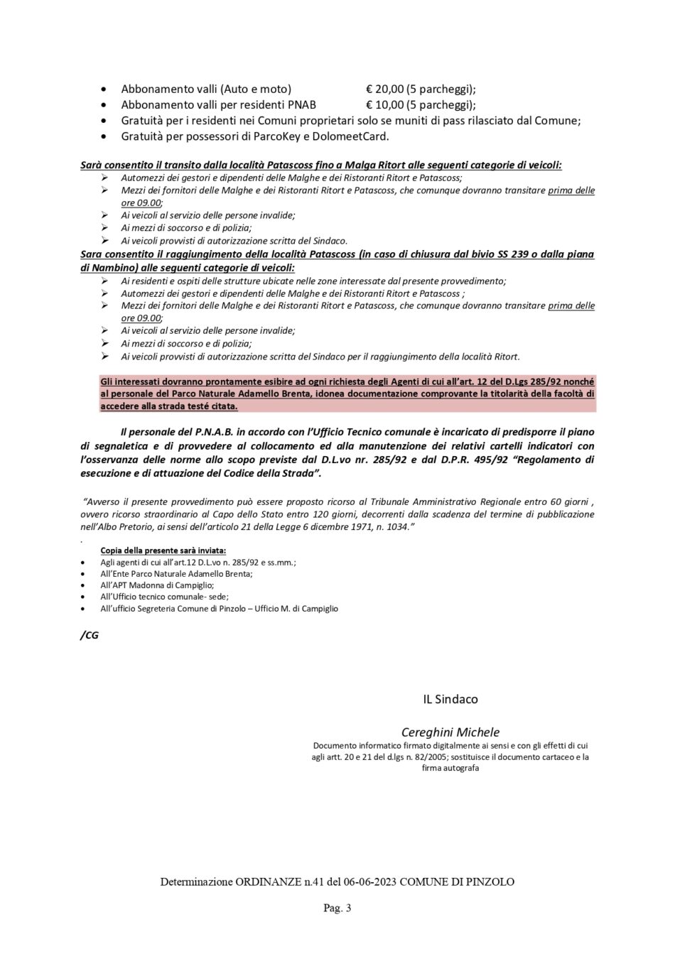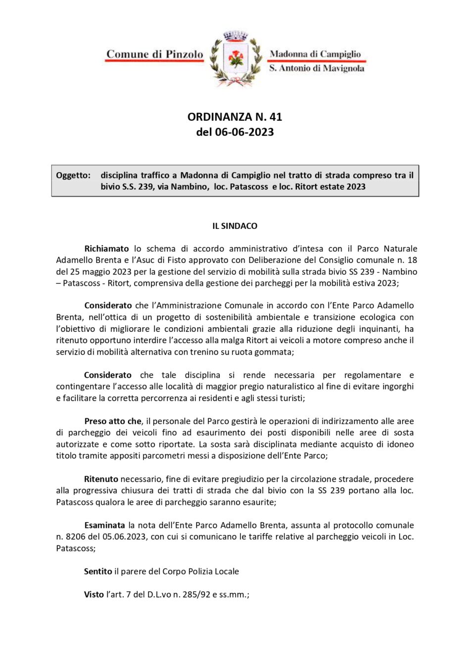 • Comune di Pinzolo: Ordinanza di chiusura della strada Patascoss-Ritort