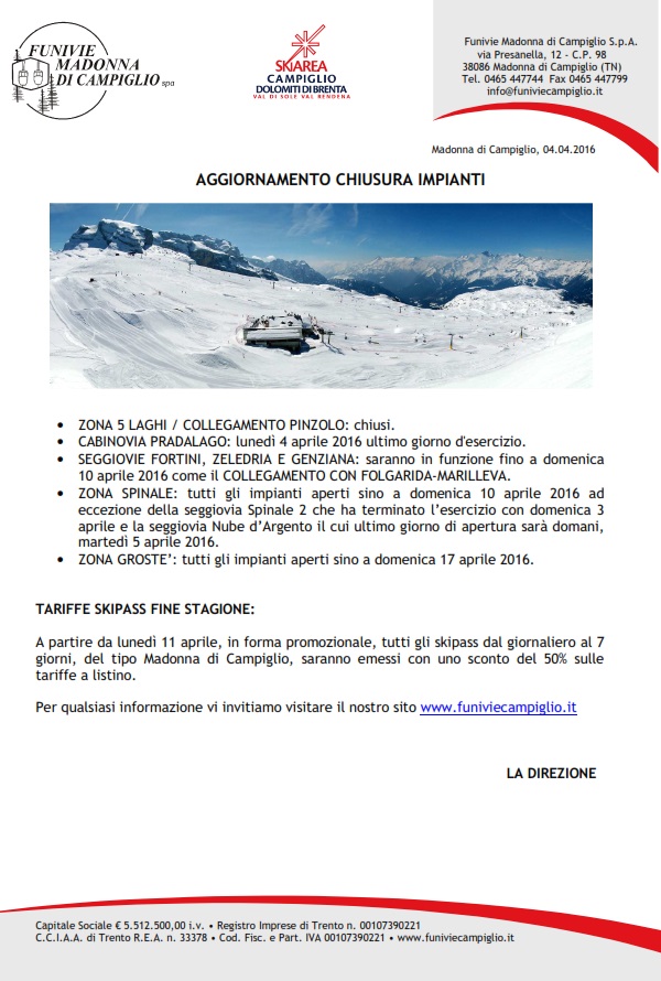 • Comunicato delle Funivie Campiglio del 4 aprile 2016