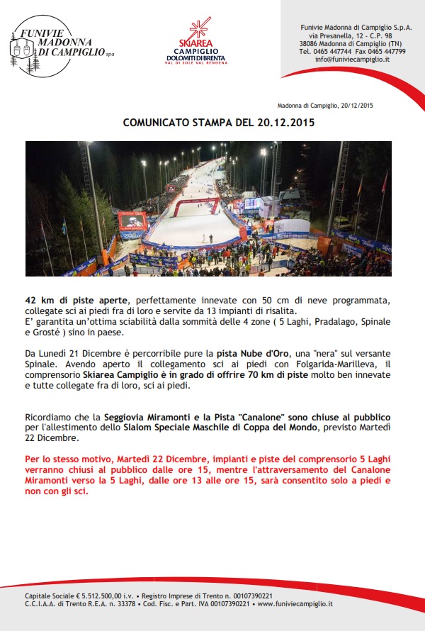 • Comunicato Funivie Campiglio del 20 dicembre 2015
