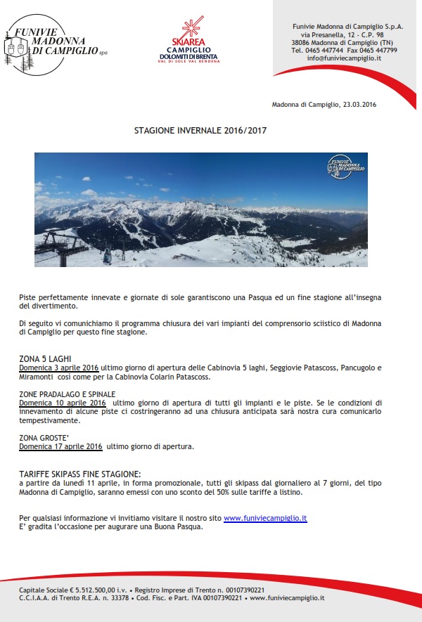 • Comunicato Funivie Campiglio del 23 marzo 2016