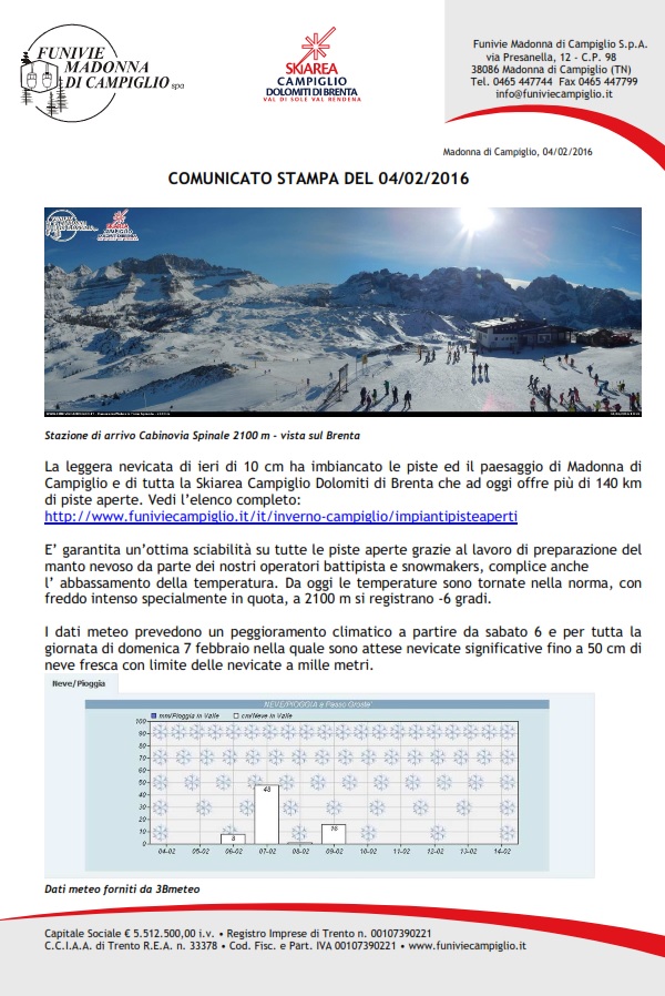 Comunicato Funivie Campiglio del 4 febbraio 2016