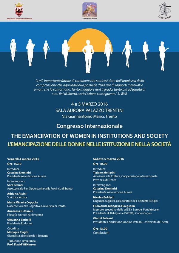 L’Associazione Culturale Aurora, in collaborazione con Il Sextante casa editrice promotrice di eventi culturali a livello internazionale con particolare attenzione alla questione femminile diretta dalla giornalista Mariapia Ciaghi, presenta il Convegno Internazionale “The emancipation of women in institutions and society”.