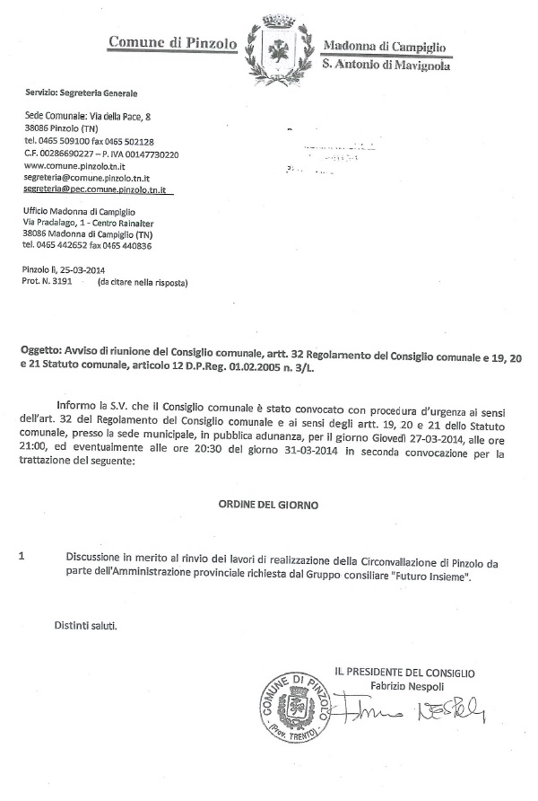 Convocazione Consiglio Comunale Pinzolo
