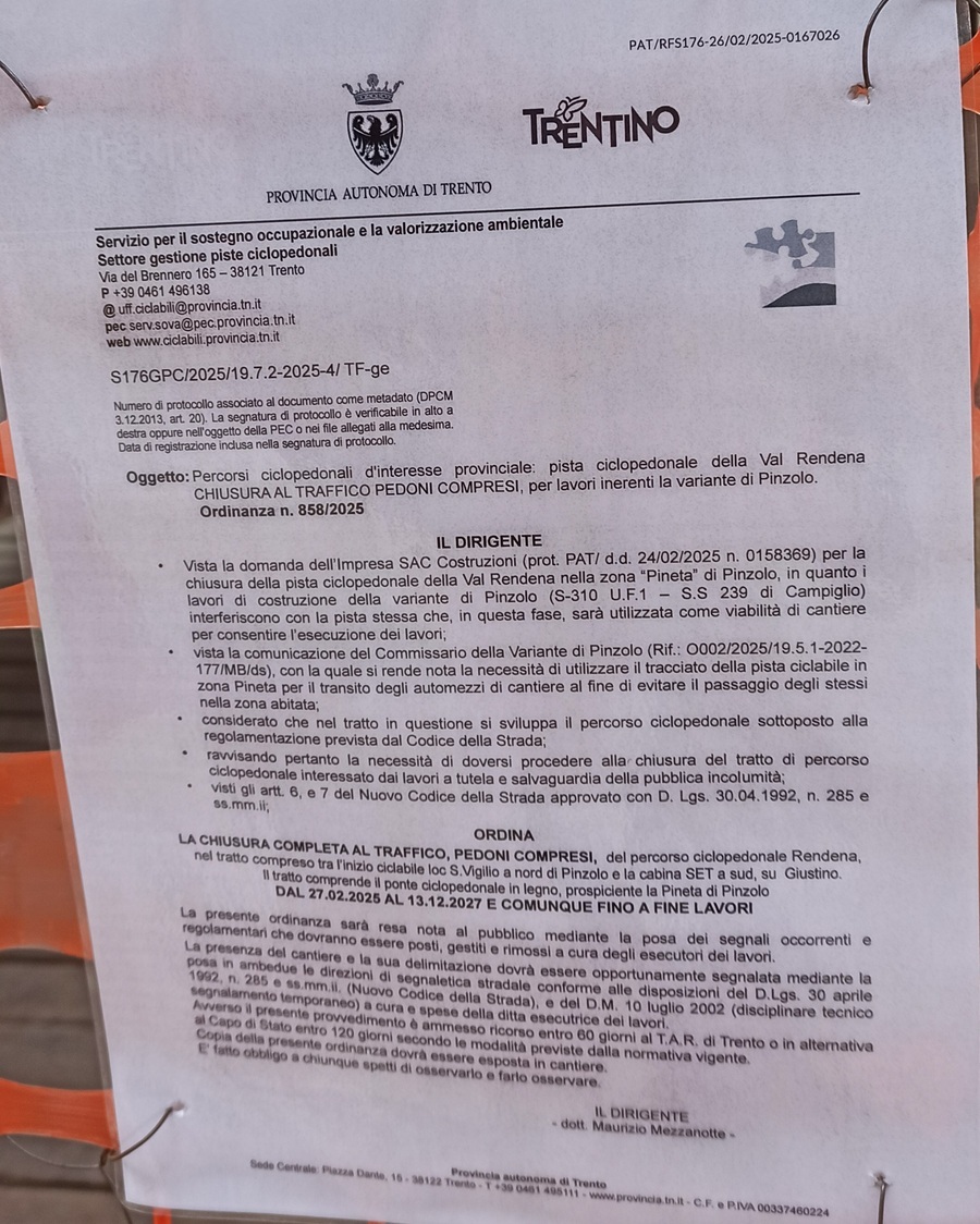 Come si legge dall’Ordinanza della Provincia di Trento esposta lungo la recinzione del cantiere, viene disposta “la chiusura completa al traffico, pedoni compresi, del percorso ciclopedonale Rendena, nel tratto compreso tra l’inizio ciclabile loc. S. Vigilio a nord di Pinzolo e la cabina SET a sud, su Giustino. Il tratto comprende il ponte ciclopedonale in legno, prospiciente la Pineta di Pinzolo dal 27.02.2025 al 13.12.2027 e comunque fino a fine lavori”.